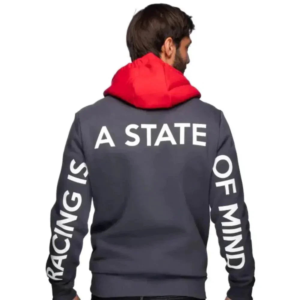 The Series 2 hoodie in anthracite has the Driver logo, which is a combination of Mick’s profile and his Formula 1 starting number, printed in white on the front. In addition, there is the quote “Racing is a state of mind” on the back of the sleeves and shoulder. The ribbed cuffs at the hem and the contrasting red hood complete the design. The hoodie is made of high-quality cotton with added polyester and is comfortable to wear.